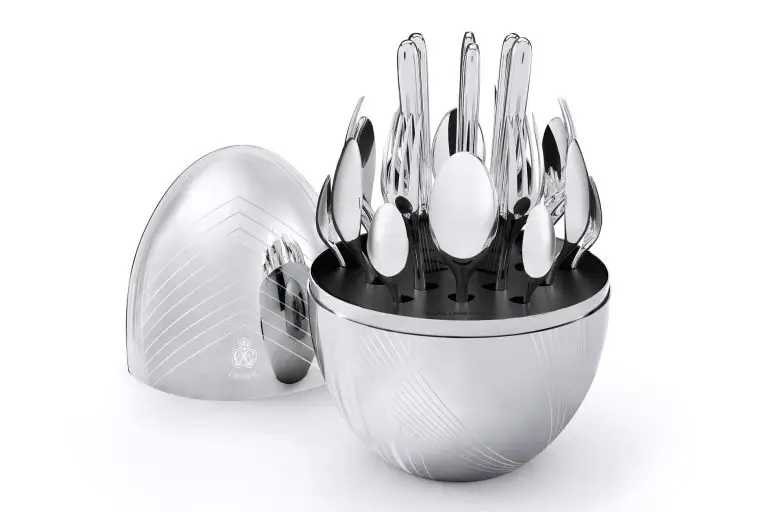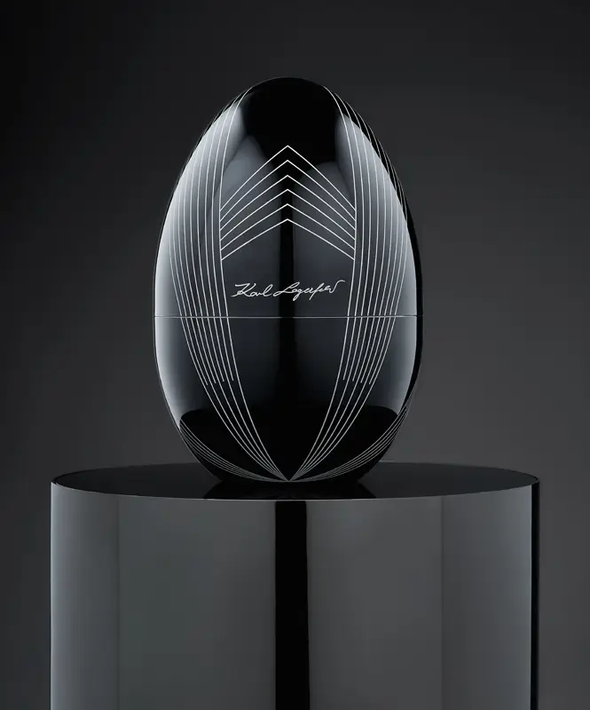 Christofle, the luxury Parisian silversmith, has collaborated with Karl Lagerfeld, on an exclusive edition of the “MOOD” flatware set and decorative case. Taking inspiration from the Art Deco movement, Karl — himself a long-time connoisseur of Christofle — designed a striking, symmetrical pattern of graphic lines to appear on the elliptical egg shape. There are two versions that have been created: one in polished silver and one in black, lacquered stainless steel.