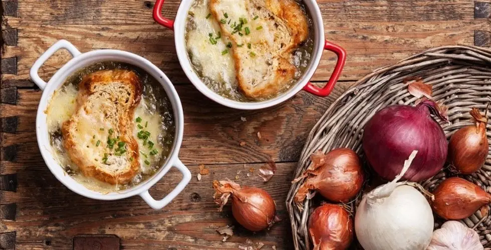 The onion soup, of modest origin, has been modernized in French gastronomy while keeping its traditional aspect. Legend has it that the soup was invented by King Louis XV. Late at night, while he was in his hunting lodge, he discovered that his provisions were only onions, butter and champagne. He cooked all three ingredients and made the first French onion soup.