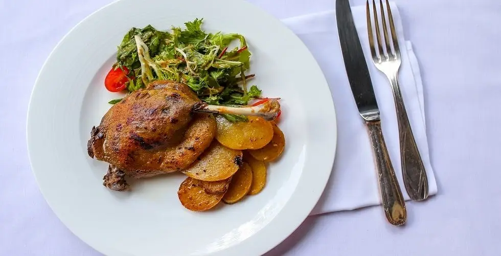 Confit de canard is a culinary specialty in southwestern France. The duck is cooked in its own fat, which makes the meat tender and tasty. Served with duck fat-fried potatoes, this dish is amazing.