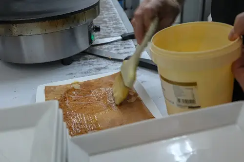 On to the main event, prepared on special pans called ‘Biligs’ imported from Brittany. Stéphane expertly prepared an exquisitely thin savoury buckwheat flour galette and covered it with a vibrant green layer of crushed avocados with a dash of cream and garlic. On top of this, fresh prawns and chopped tomatoes are added. The crisp, light crêpe proved the perfect foil for the smooth, creamy avocado while the dash of garlic adds that bit of complexity that many avocado dishes lack. Tomato always works with avocado in my opinion and the chopped chunks of red contrasted beautifully with their green bed and provided a delightful sweet-sour tang every time I bit into one. If you are looking for something on top of their classics, get this.