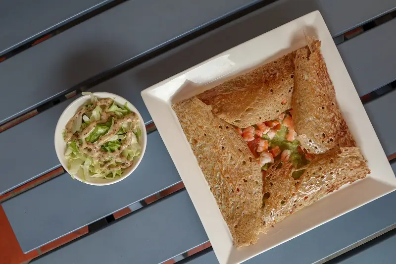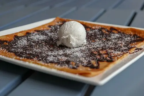 For dessert, Entre-Nous serves up sweet crepes prepared with wheat flour. You can never go wrong with stalwarts like their homemade salted butter or butter and sugar options. However, if you’d like to try something a bit more special, try the “Faustine’s Favourite”. This crêpe comes liberally doused in a rich homemade chocolate sauce studded with grated coconut. A scoop of coconut sorbet (all their ice creams and homemade) takes pride of place in the centre of the dish. My favourite childhood chocolate bar was Bounty (chocolate bars stuffed with coconut) so this was familiar but elevated. The lashings of decadent chocolate sauce paired beautifully with the soft crêpe and cold ice cream.