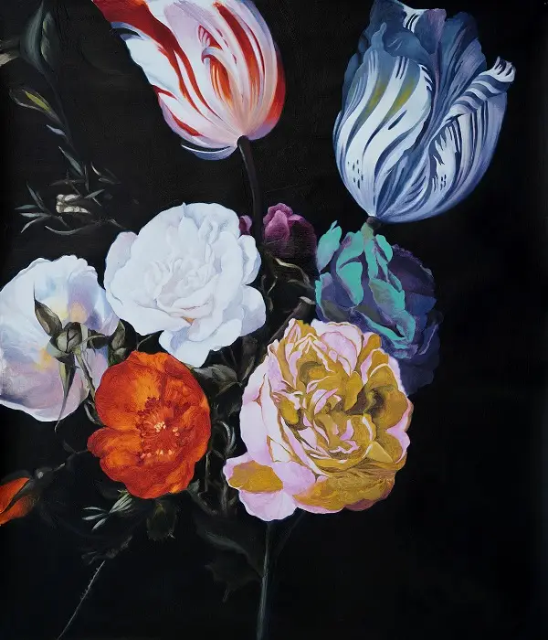 In the Nebulae series they are flowers in the form of spots that allow a much freer expression of colour. I buy bouquets of flowers for my wife and then I take pictures of them that I blur and I paint these visuals that have a cosmic and aquatic dimension for me. The second series, Nocturnes, are bouquets of flowers that references the old Dutch masters from the 17th century. They wanted to transcribe the beauty of the flower on a dark background by letting the original light express itself. I wanted to reframe her bouquets of flowers by adding a relationship to pop art through a colorful flat tint.