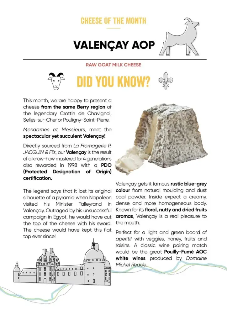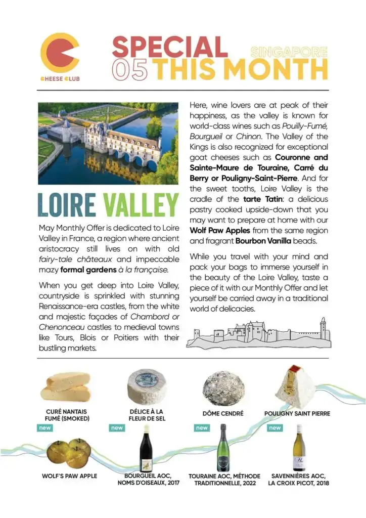 This month, Cheese Club welcomes you to Loire Valley: just a couple hours drive south west of Paris. A Charming place out of time, where drinking a glass of Pouilly-Fume while tasting some delicate goat cheeses is part of the local traditions: simple and authentic.