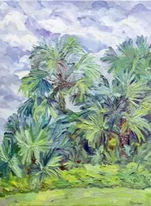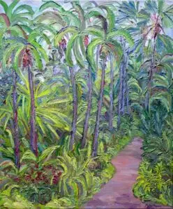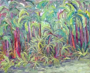 Applying deliciously thick oil paint, I endeavor through my bright paintings to communicate a sense of the abundance and exuberance of the tropical plants that grow profusely around us in Singapore.