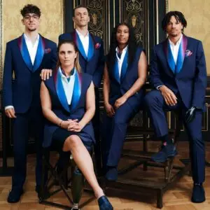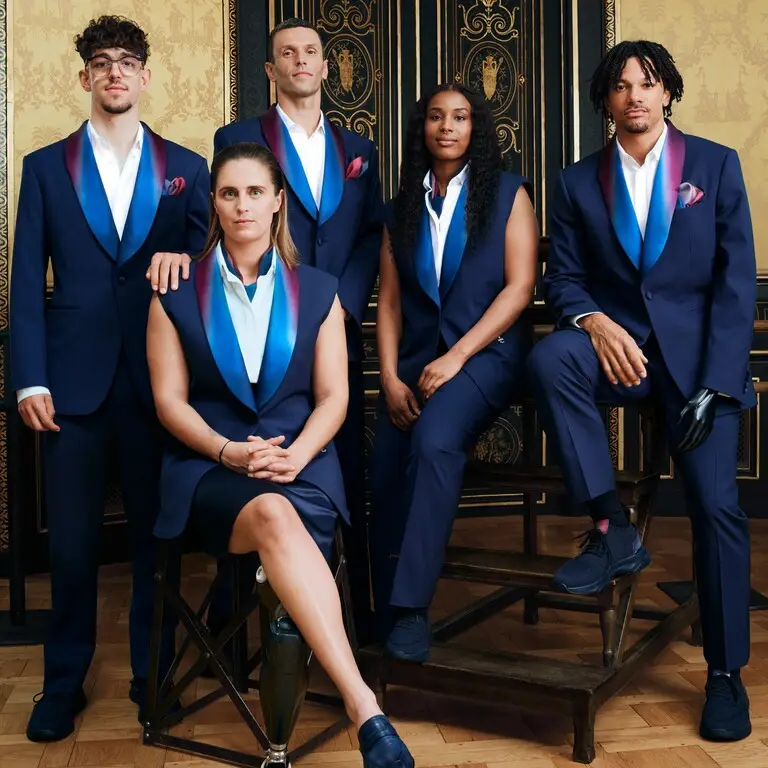 Berluti has been selected to design the uniforms for the French team, bringing a touch of luxury and style to the athletes’ appearance. Known for its impeccable tailoring and use of the finest materials, Berluti ensures the French team will be as stylish as they are competitive. Indeed, France’s national team walked into the opening ceremony with an air of sophisticated confidence. We especially love the tricolor lapel!