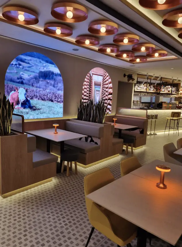 The space is full of stories — from the copper-ring ceiling lights echoing traditional cheese-making vats to the warm wood tones reminiscent of a chalet. There’s even a cosy outdoor terrace, perfect for sunny lunches or laid-back after-work bites.